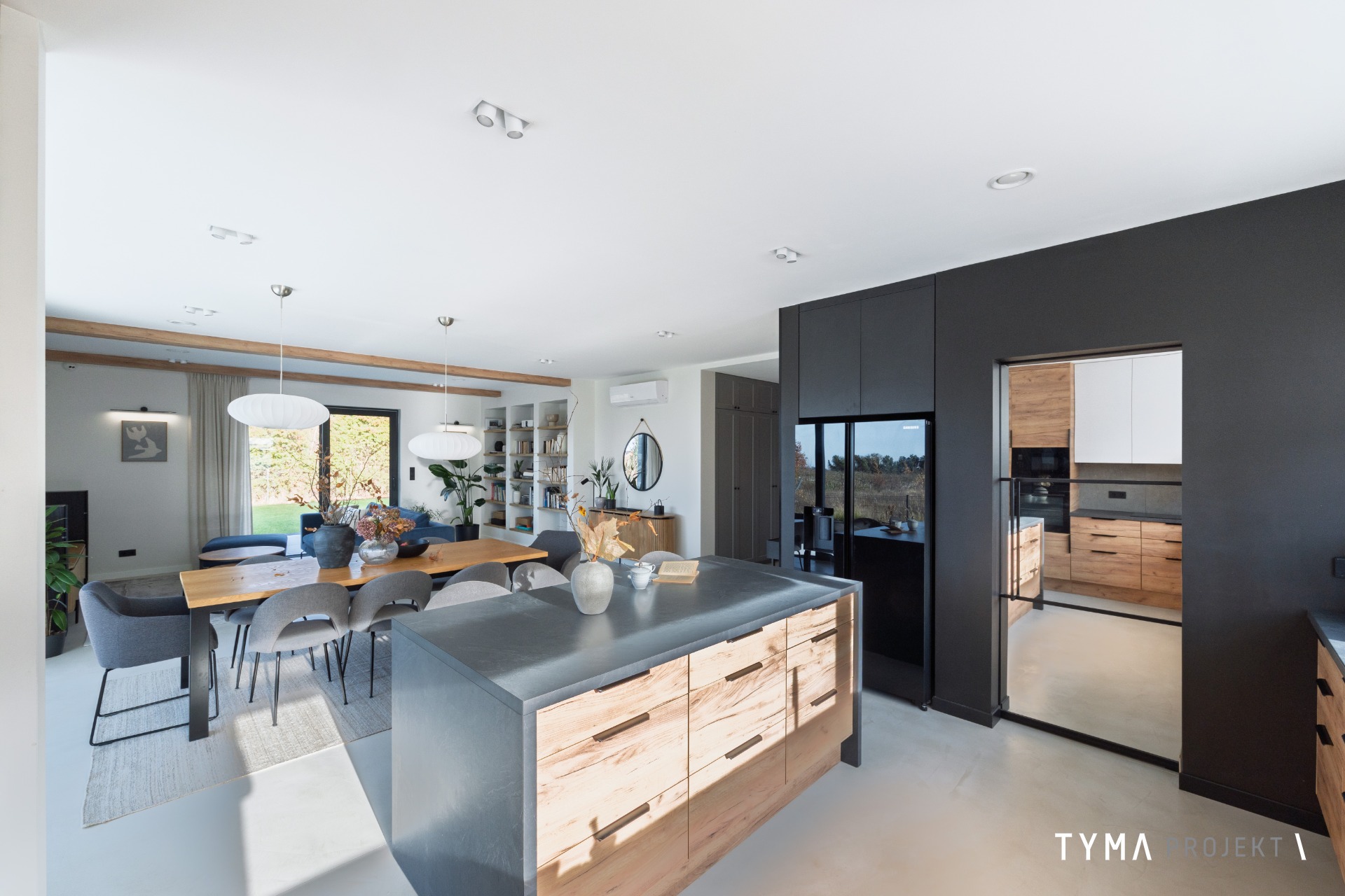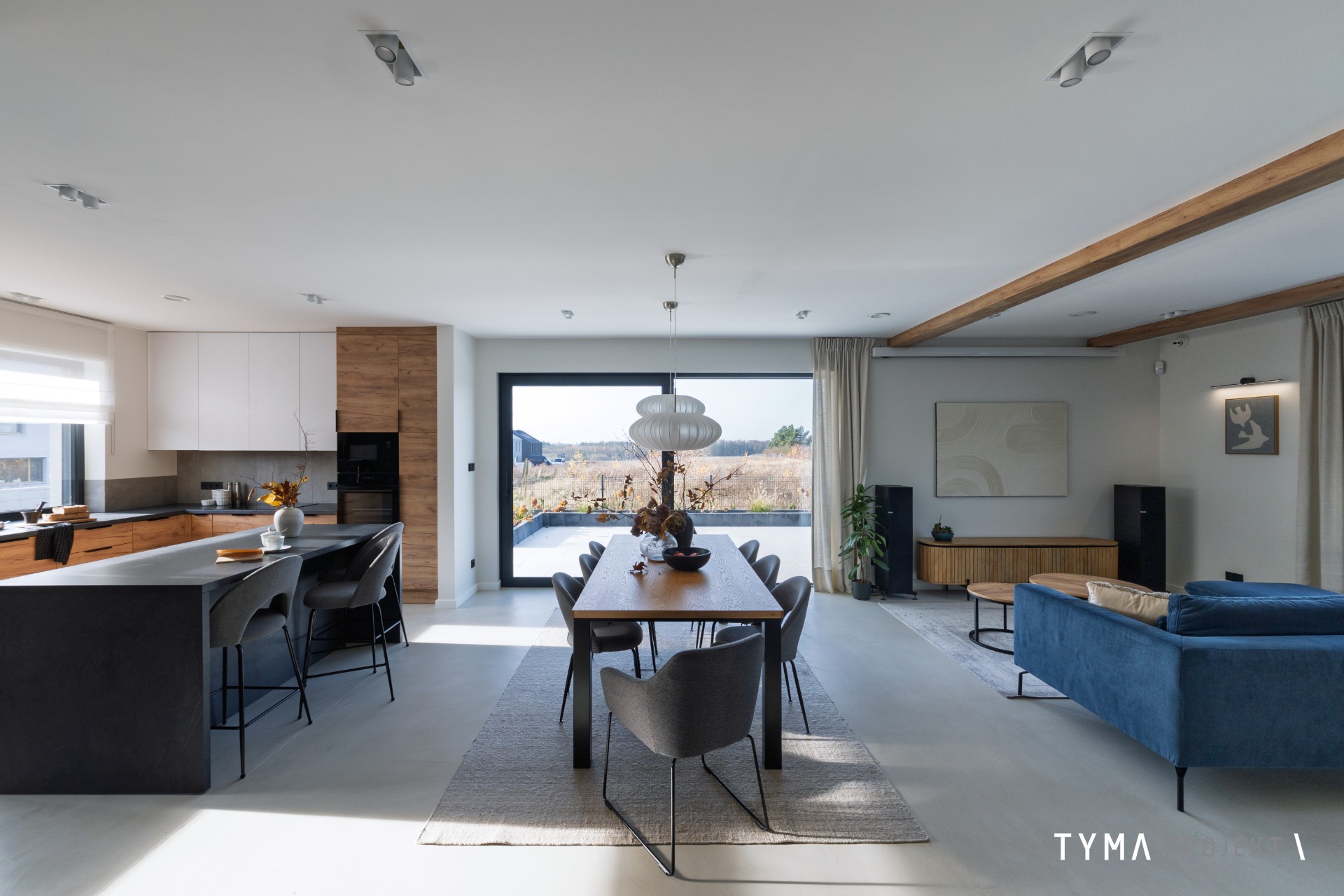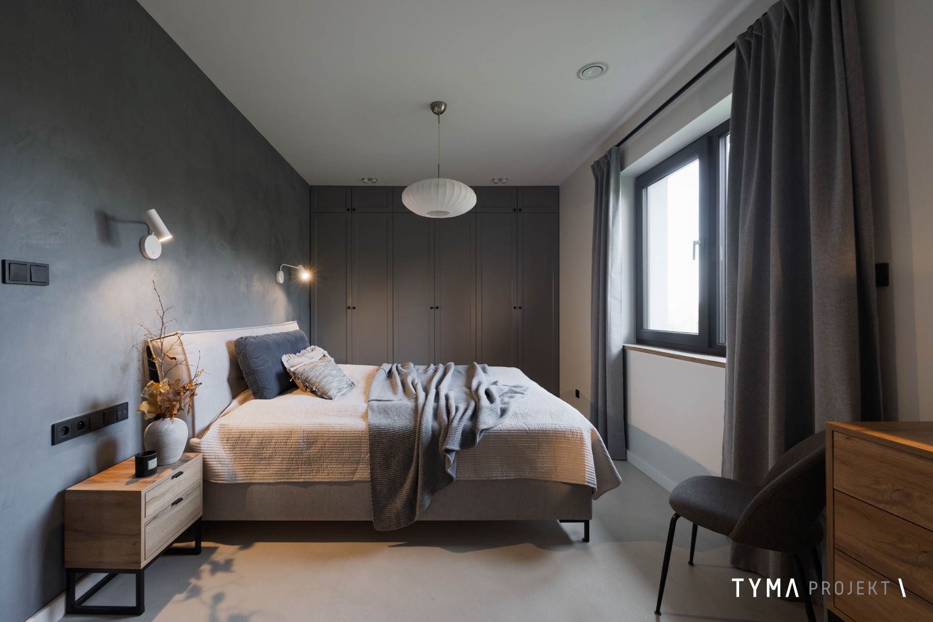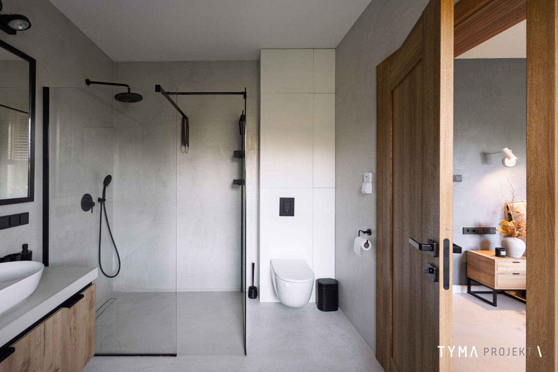 Wnętrze pełne naturalnych materiałów na delikatnym pastelowym tle. Centralny punkt domu stanowi salon zaprojektowany jako otwarta, reprezentacyjna przestrzeń sprzyjająca codziennemu wypoczynkowi i spotkaniom. Na podłogach oraz w łazienkach znajdziecie mikrocement, który nadaje przestrzeni jednolity charakter. Przeciwwagą dla odcieni beżu są kolory naturalnego dębu obecne w zabudowie meblowej i detalach. Tynk strukturalny w sypialni nadaje jej wyjątkowo kameralnego charakteru. W tym domu każdy członek rodziny znajdzie swój przyjazny kąt!