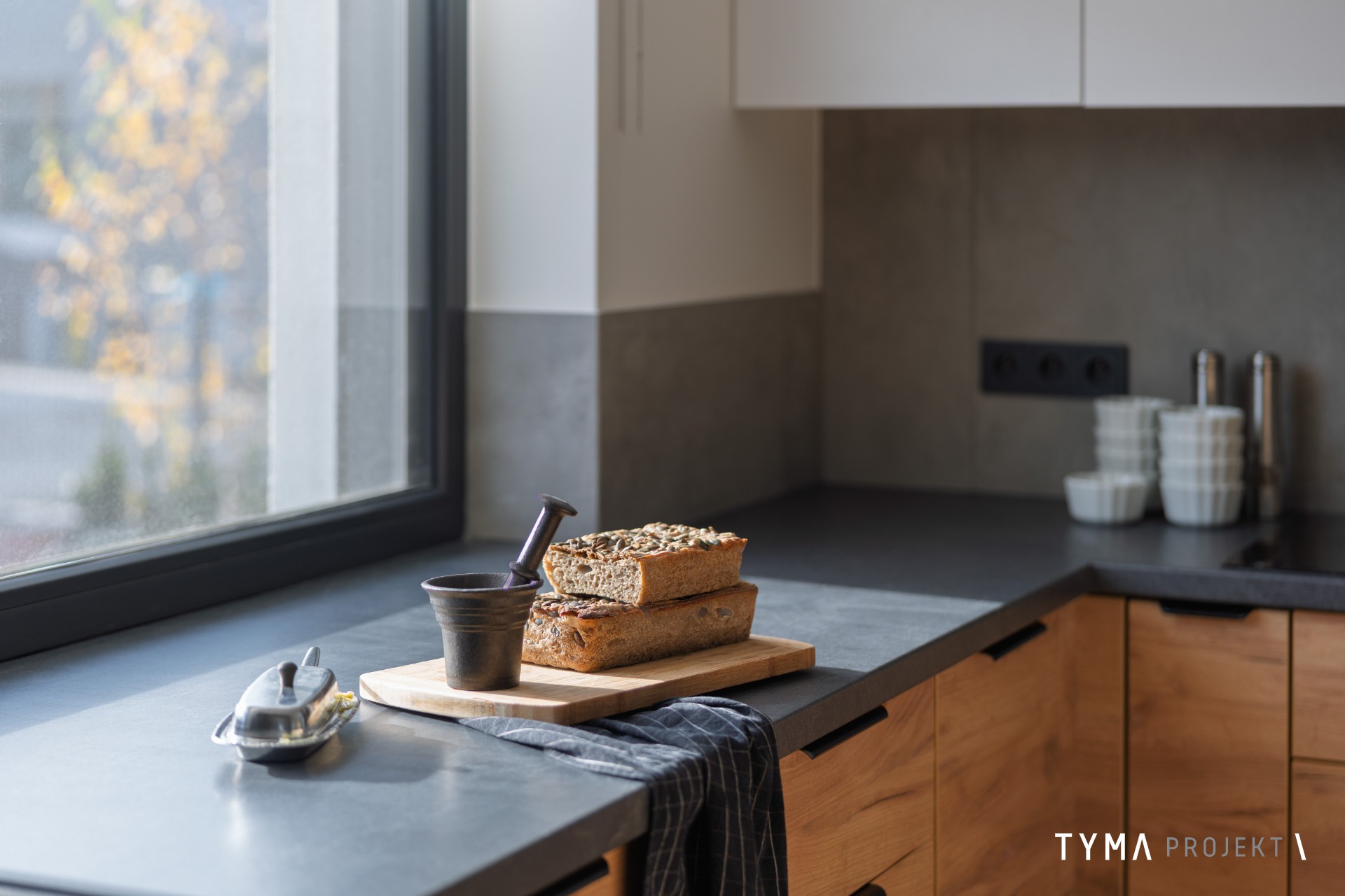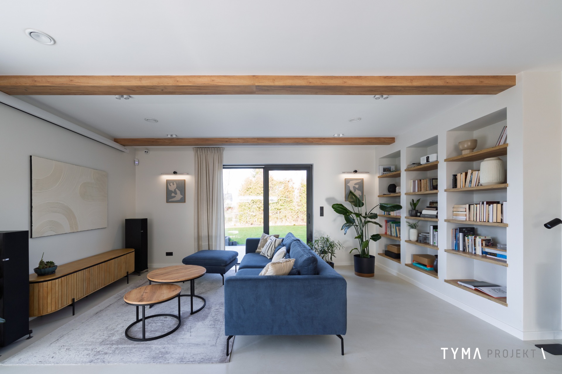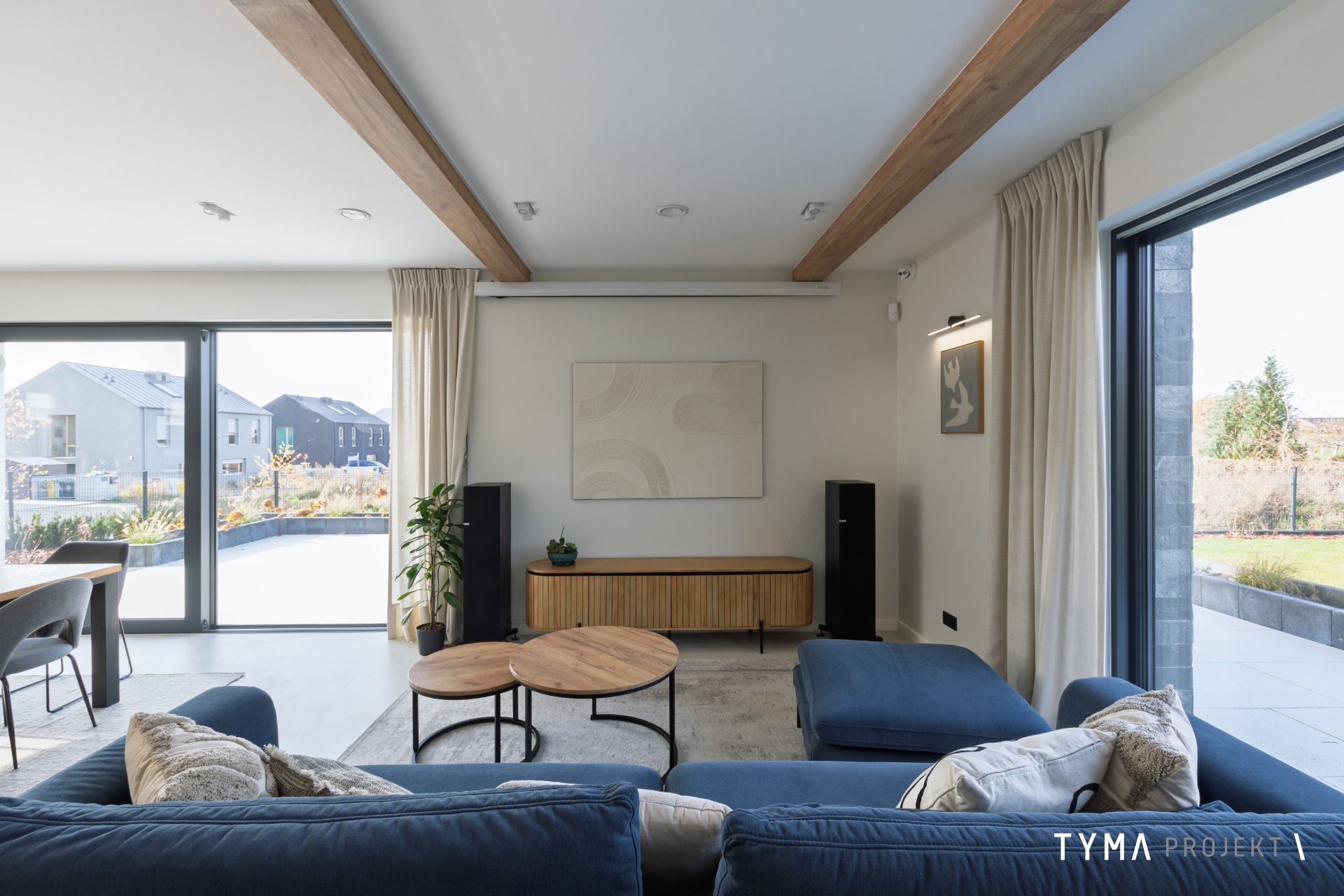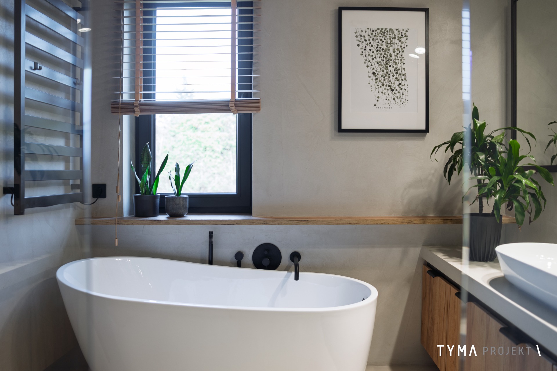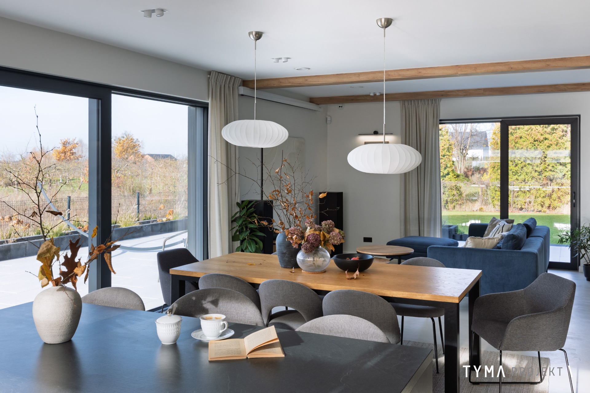 Wnętrze pełne naturalnych materiałów na delikatnym pastelowym tle. Centralny punkt domu stanowi salon zaprojektowany jako otwarta, reprezentacyjna przestrzeń sprzyjająca codziennemu wypoczynkowi i spotkaniom. Na podłogach oraz w łazienkach znajdziecie mikrocement, który nadaje przestrzeni jednolity charakter. Przeciwwagą dla odcieni beżu są kolory naturalnego dębu obecne w zabudowie meblowej i detalach. Tynk strukturalny w sypialni nadaje jej wyjątkowo kameralnego charakteru. W tym domu każdy członek rodziny znajdzie swój przyjazny kąt!