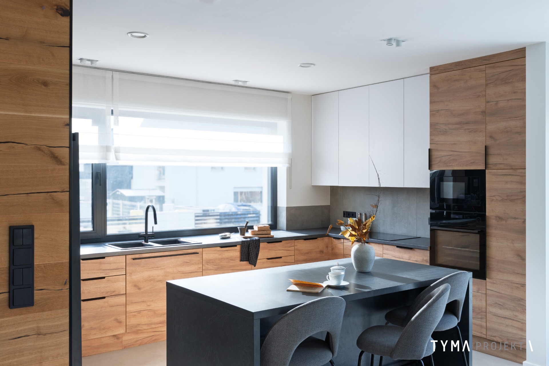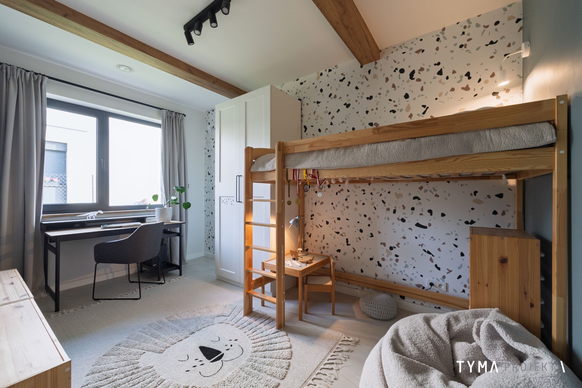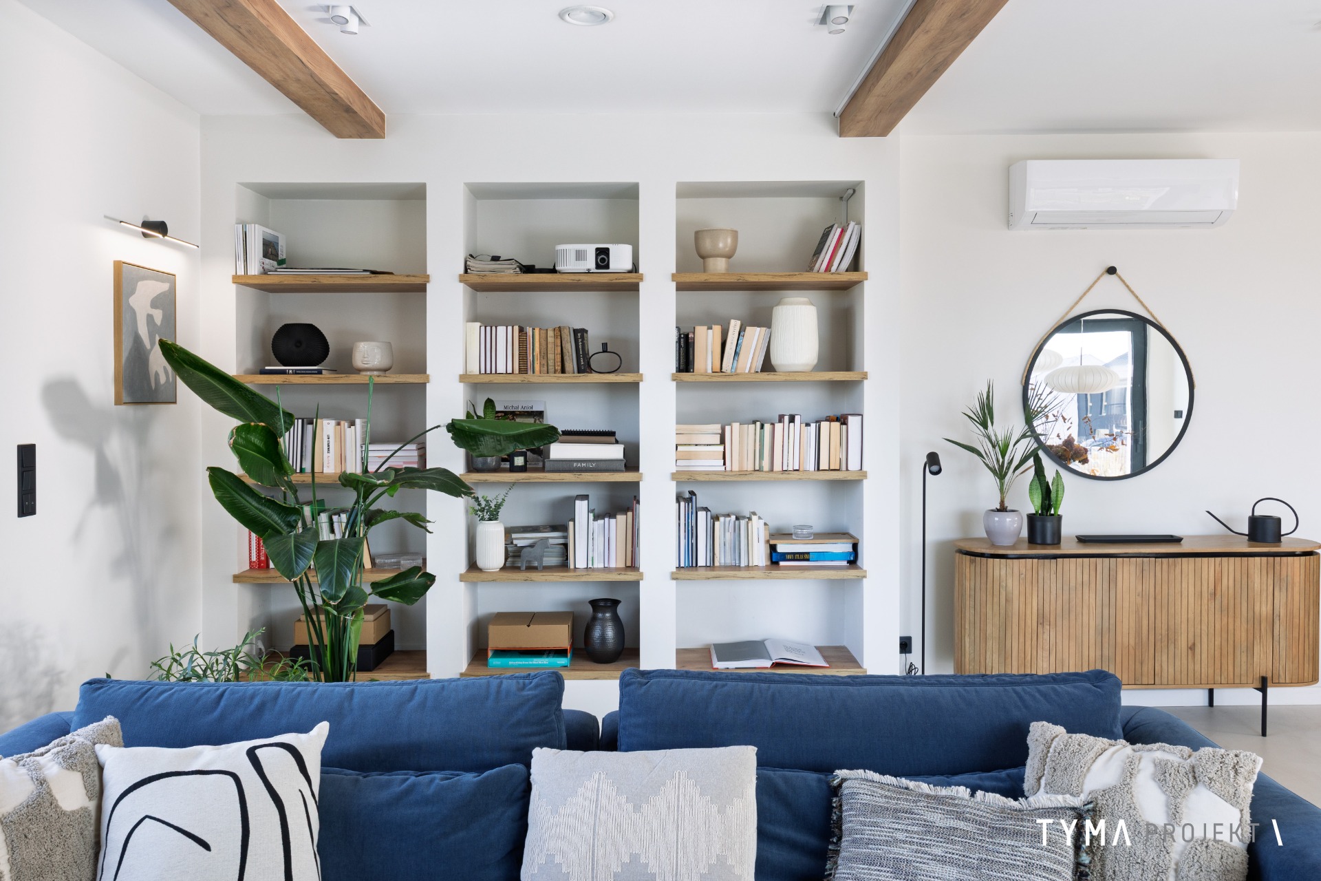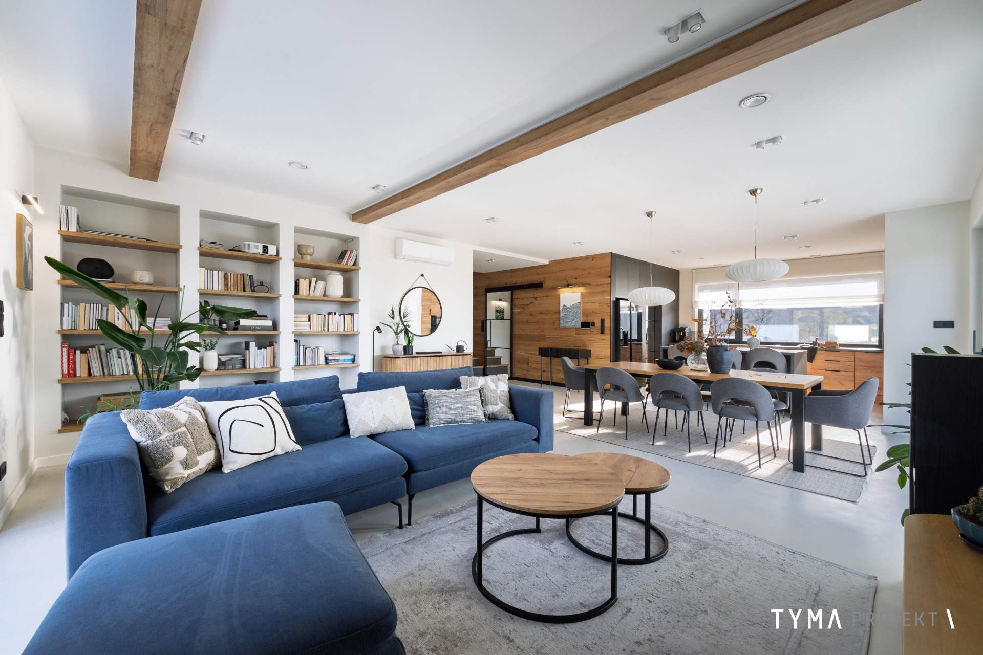 Wnętrze pełne naturalnych materiałów na delikatnym pastelowym tle. Centralny punkt domu stanowi salon zaprojektowany jako otwarta, reprezentacyjna przestrzeń sprzyjająca codziennemu wypoczynkowi i spotkaniom. Na podłogach oraz w łazienkach znajdziecie mikrocement, który nadaje przestrzeni jednolity charakter. Przeciwwagą dla odcieni beżu są kolory naturalnego dębu obecne w zabudowie meblowej i detalach. Tynk strukturalny w sypialni nadaje jej wyjątkowo kameralnego charakteru. W tym domu każdy członek rodziny znajdzie swój przyjazny kąt!