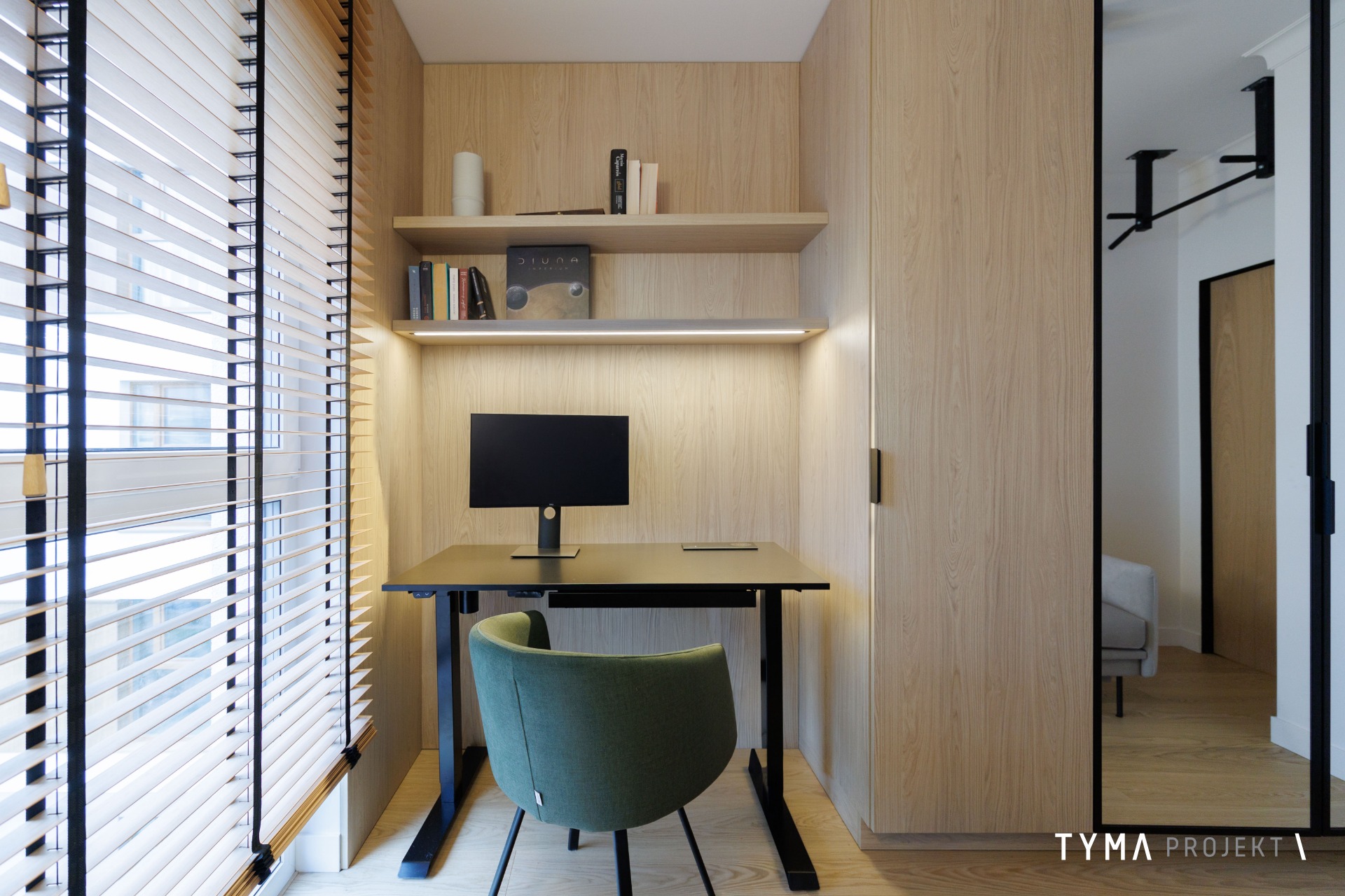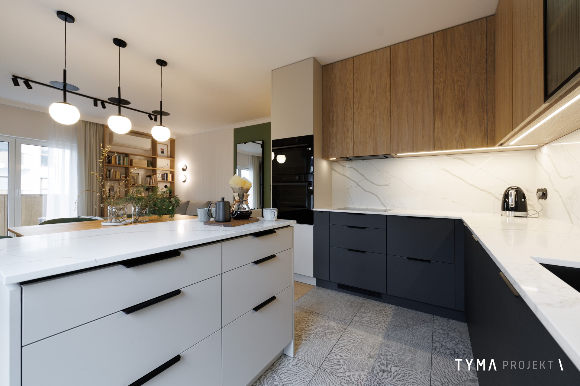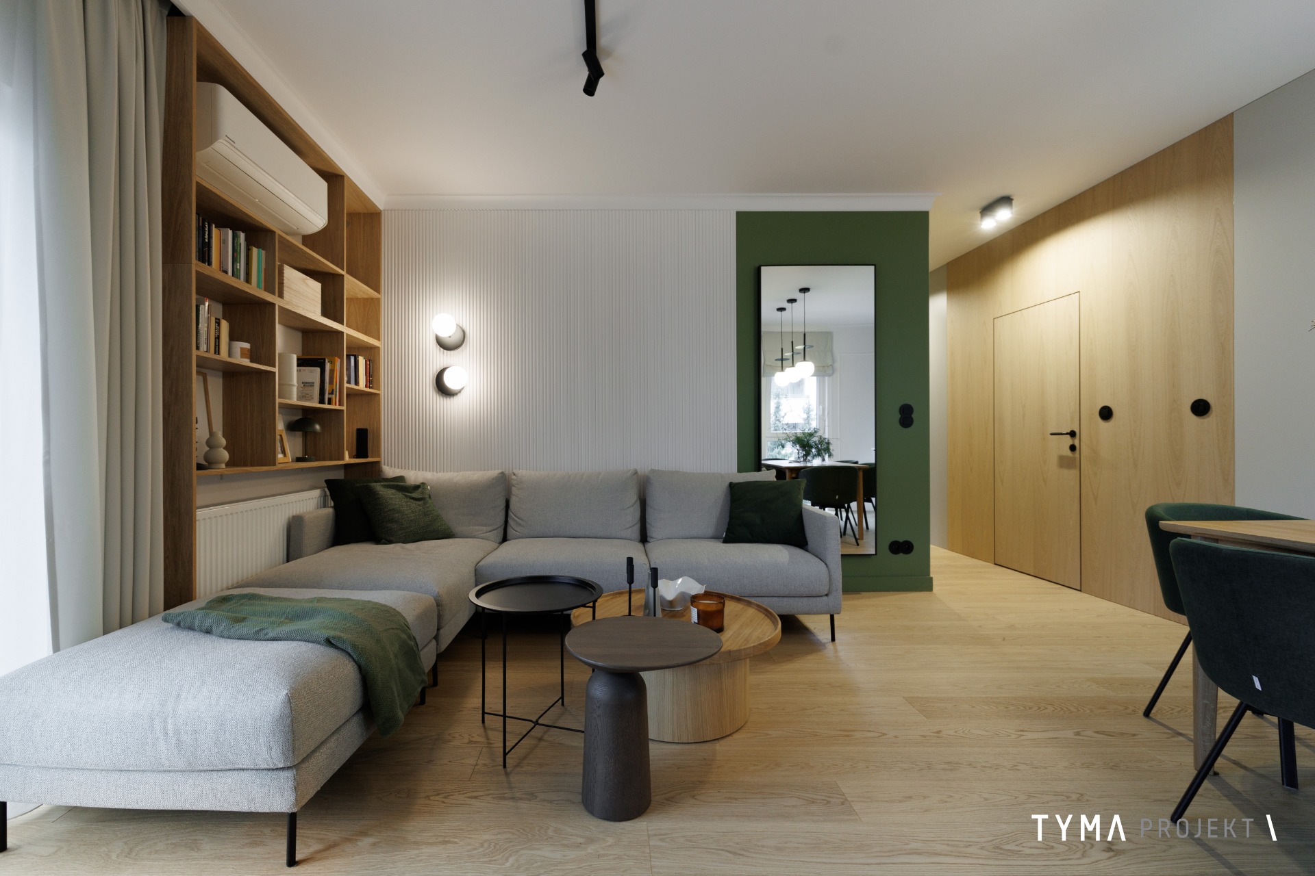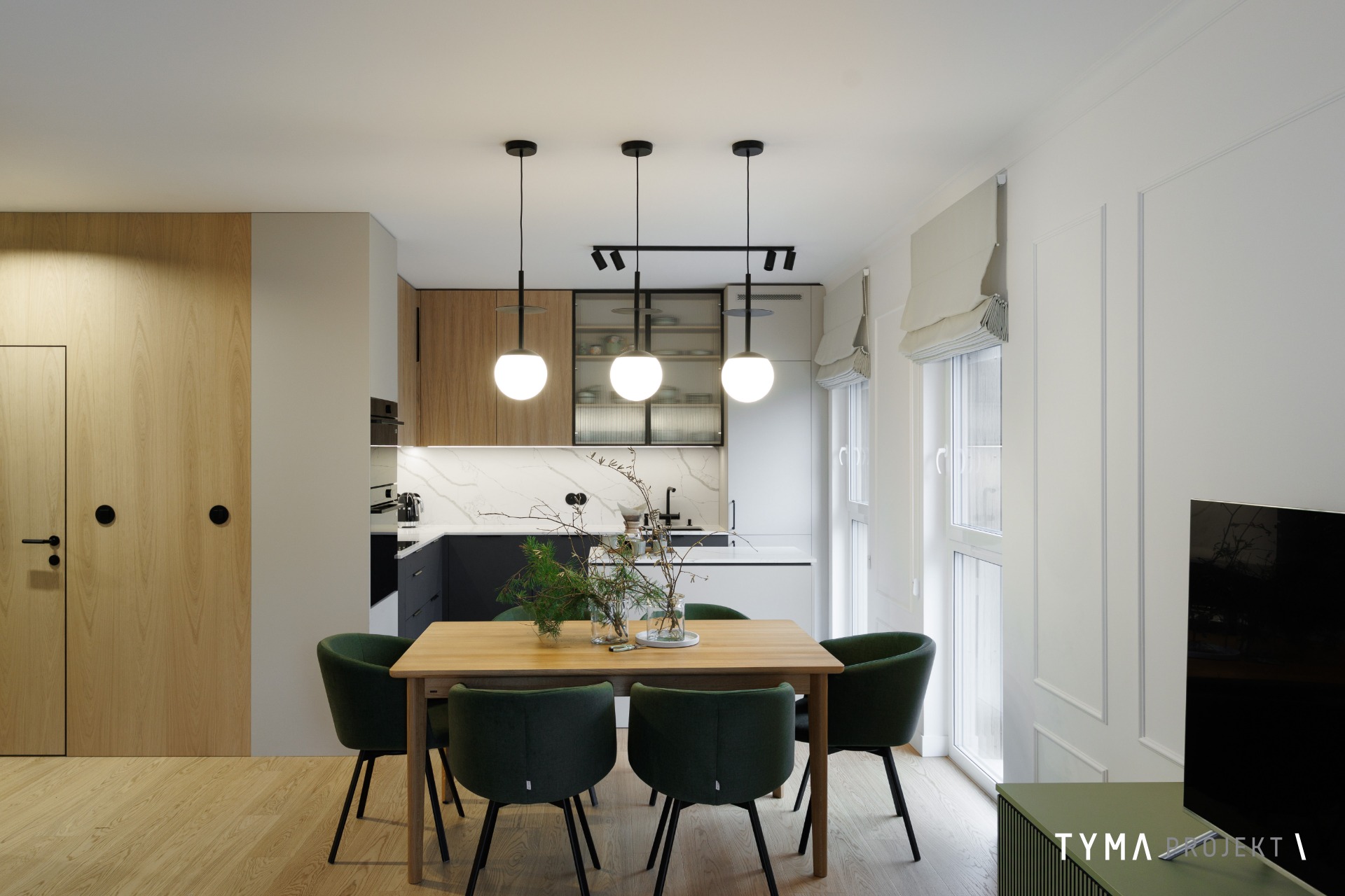 Projekt mieszkania opiera się na funkcjonalnych rozwiązaniach i spójnej palecie materiałów. Strefę dzienną tworzą: sofa Dion, uzupełniona stołem Take me Home oraz krzesłami i stolikami kawowymi z IWC Home. Całość dopełnia podłoga Scheucher. Korytarz wyróżnia się drzwiami i okładzinami Moric, a gabinet uzupełniają biurko i szafka z Minko. W kuchni znajdziecie fronty w naturalnym fornirze oraz w wykończeniu Egger Perfect Sense. Oświetlenie zapewniają tu lampy Ummo. Okna wykończone są pięknymi tkaninami od Hotelove, a charakter wnętrza dopełnia sztukateria Mardom Decor.