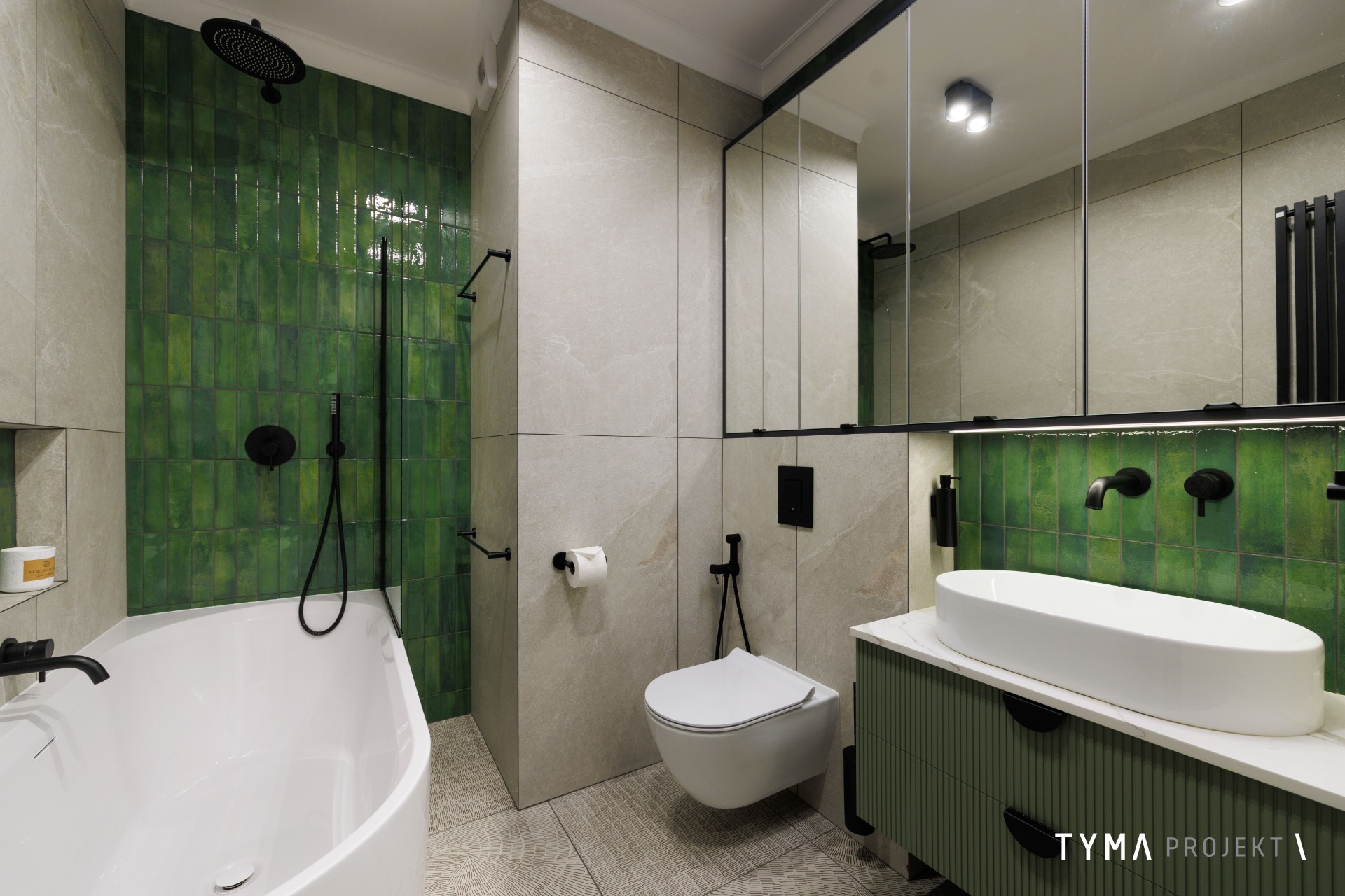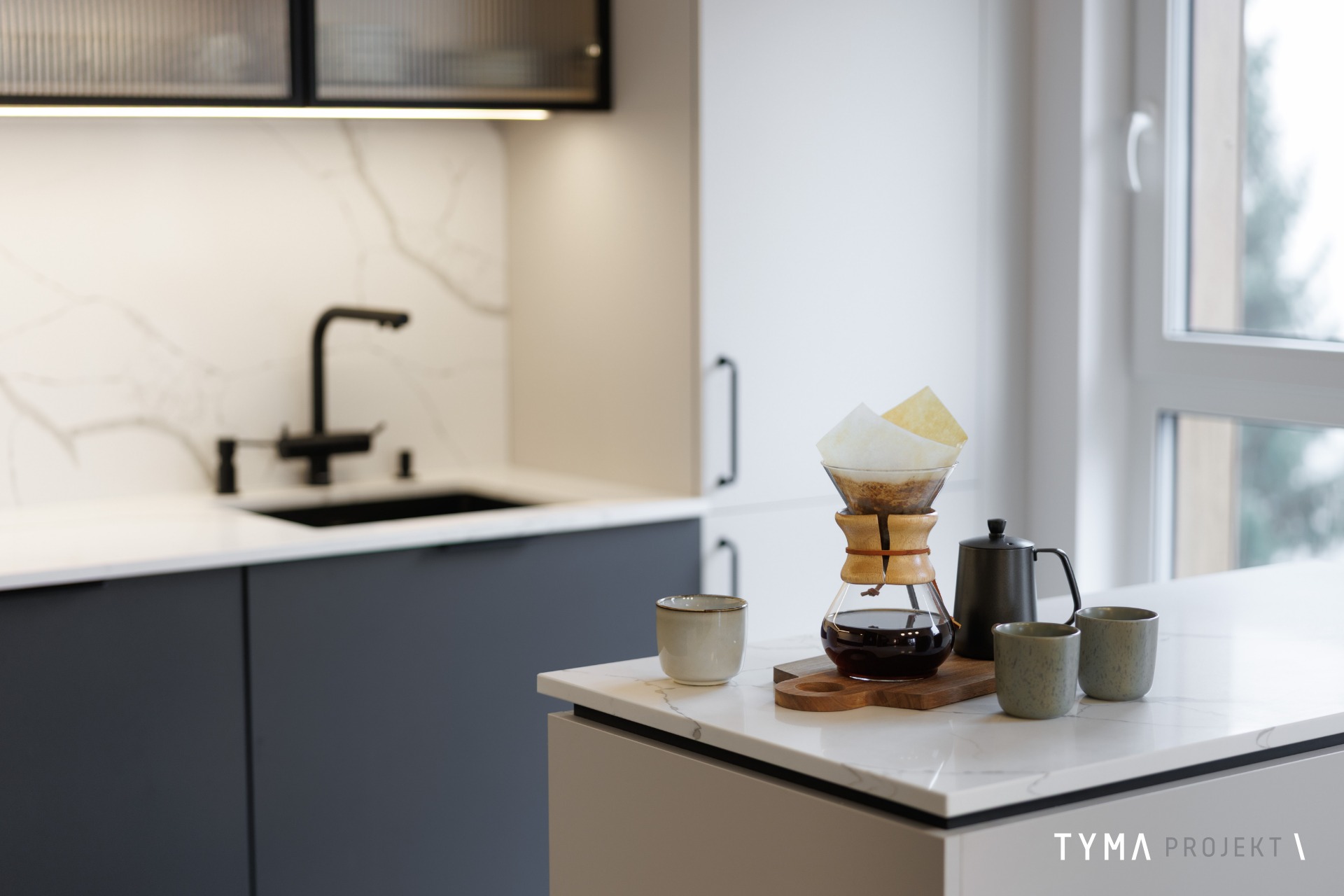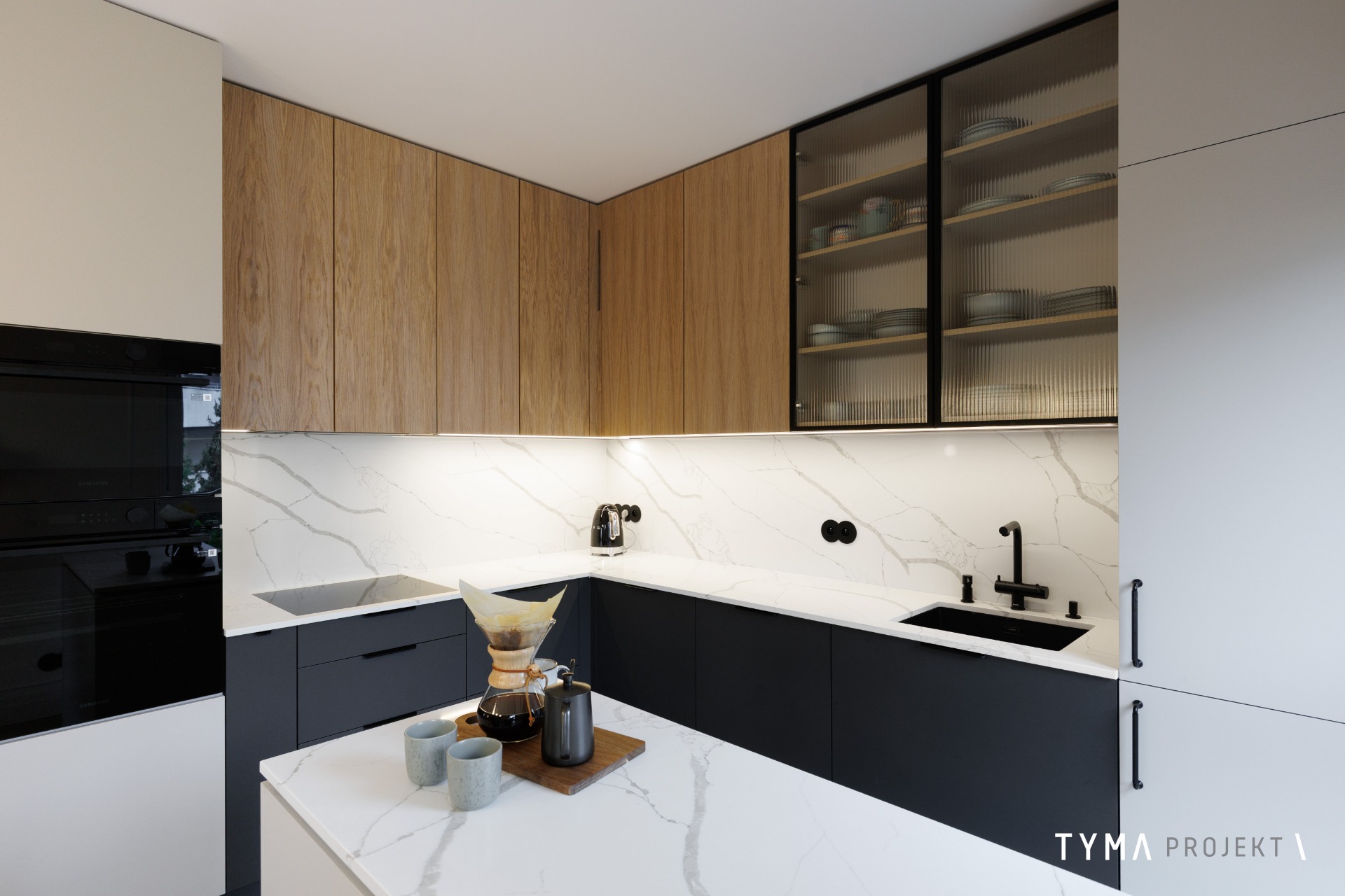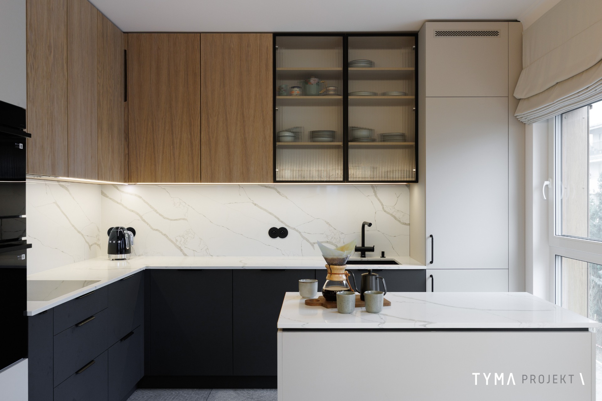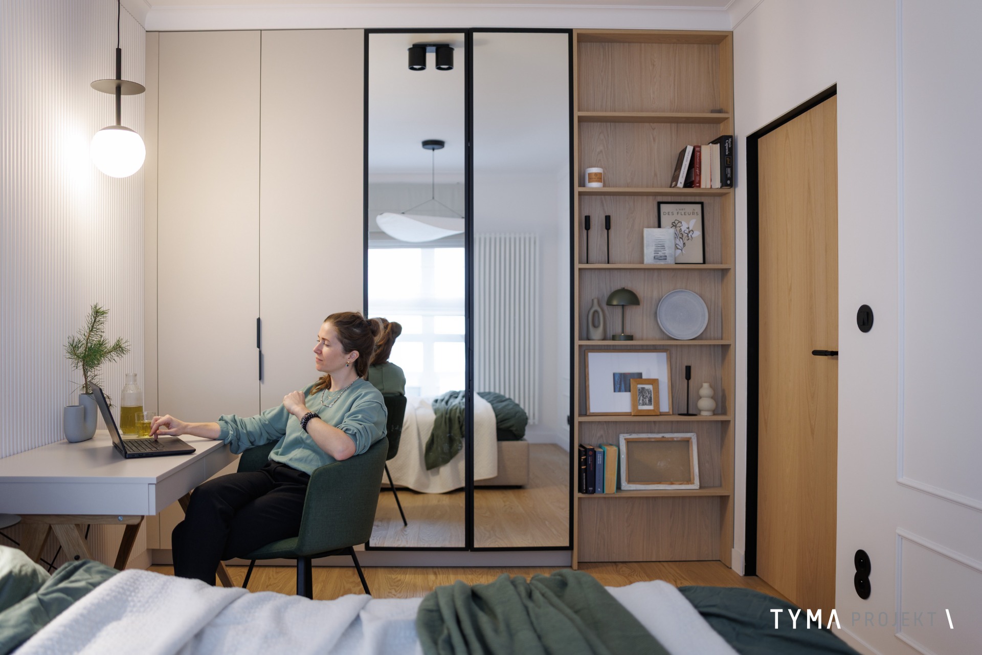 Projekt mieszkania opiera się na funkcjonalnych rozwiązaniach i spójnej palecie materiałów. Strefę dzienną tworzą: sofa Dion, uzupełniona stołem Take me Home oraz krzesłami i stolikami kawowymi z IWC Home. Całość dopełnia podłoga Scheucher. Korytarz wyróżnia się drzwiami i okładzinami Moric, a gabinet uzupełniają biurko i szafka z Minko. W kuchni znajdziecie fronty w naturalnym fornirze oraz w wykończeniu Egger Perfect Sense. Oświetlenie zapewniają tu lampy Ummo. Okna wykończone są pięknymi tkaninami od Hotelove, a charakter wnętrza dopełnia sztukateria Mardom Decor.